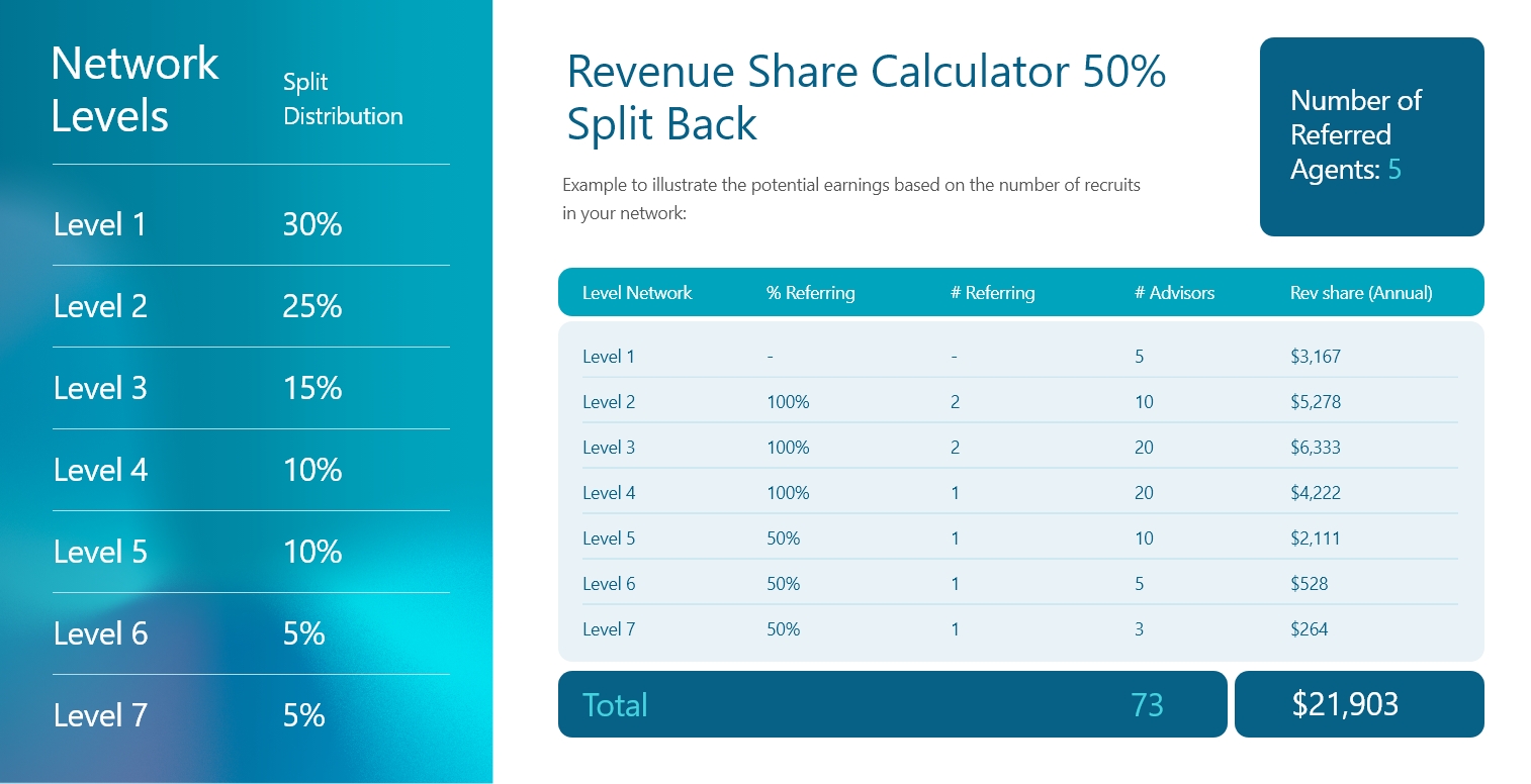 The earning potential doesn’t end with just those you directly recruit. Each time of any of the advisors you recruit adds to their roster of recruits, you become eligible to share in their earning, too. This continues up to seven total levels of earnings that can be available to you.
